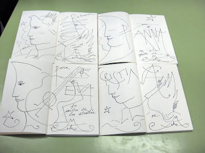 Los alumnos se acercaron a la mesa con sus libros a charlar con el poeta. Él les regaló como dedicatoria una ilustración originalísima realizada in situ para cada uno de ellos. Fue muy generoso con todos. Seleccionamos de Escribiendo que es gerundio algunas de sus opiniones. Es nuestro pequeño homenaje al autor: